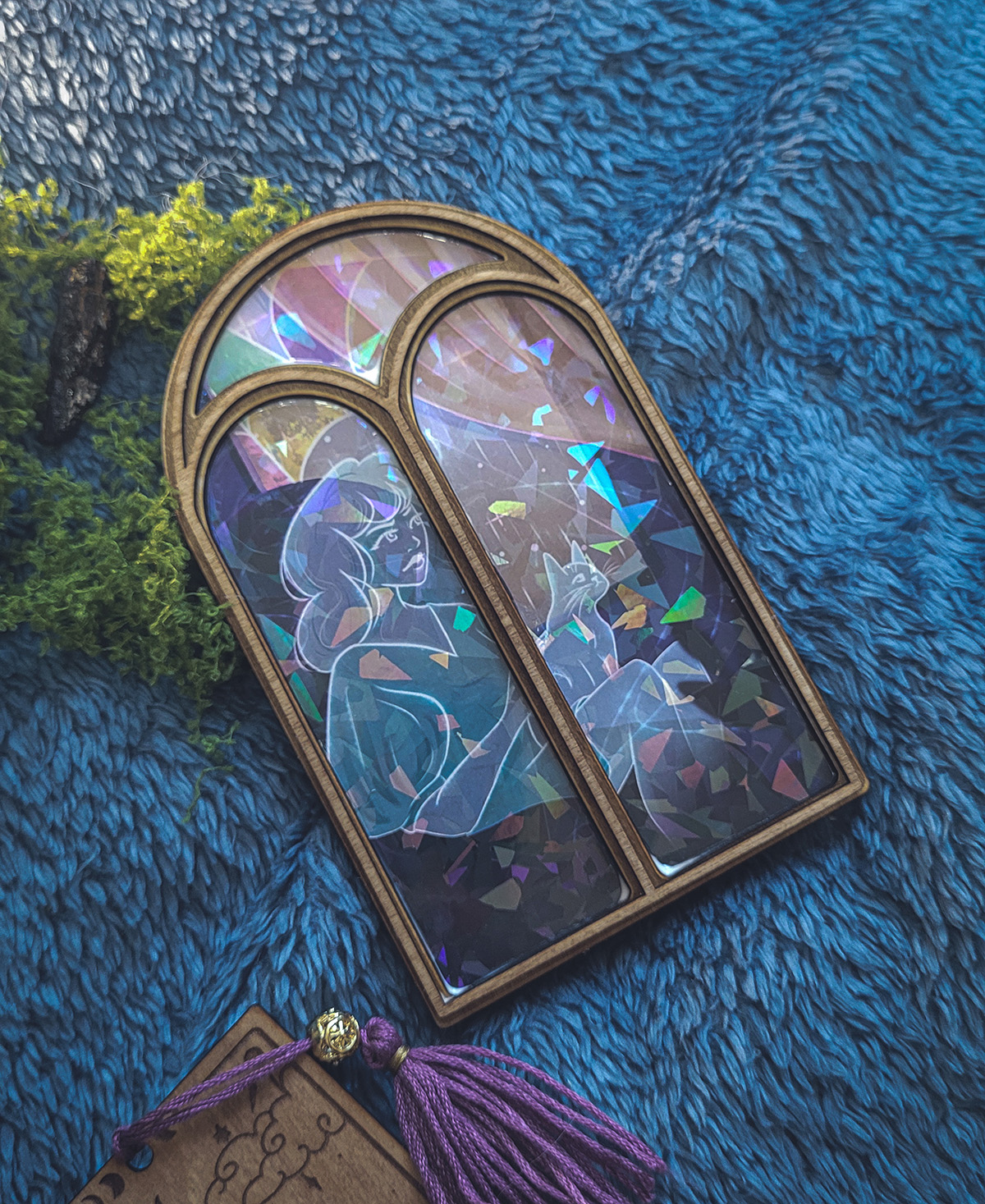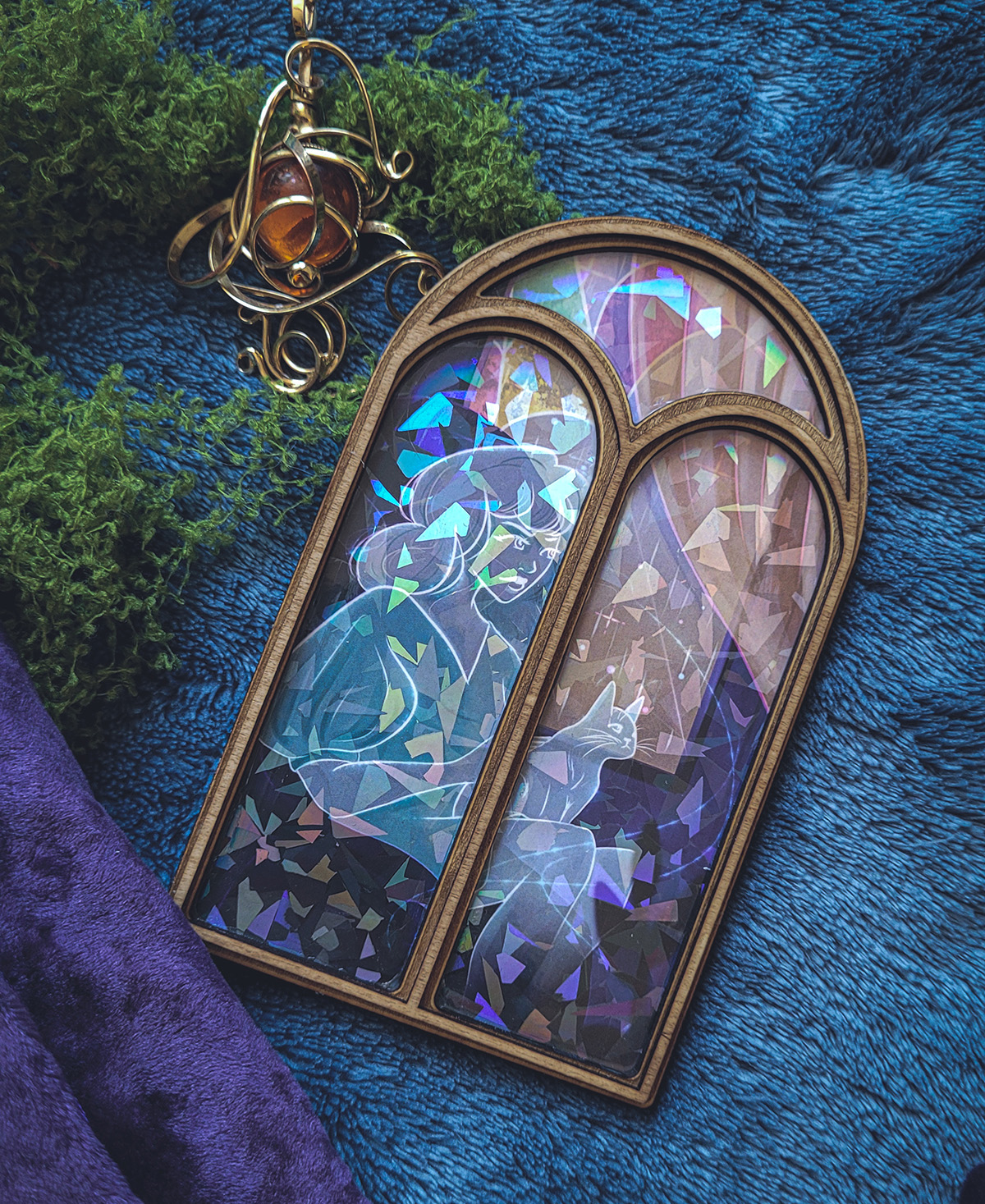 Cette fenêtre décorative en bois révèle une illustration holographique réalisée par mes soins : une sorcière spectrale accompagnée de son chat fantôme, figés dans une lumière changeante qui capte les reflets de la lune.